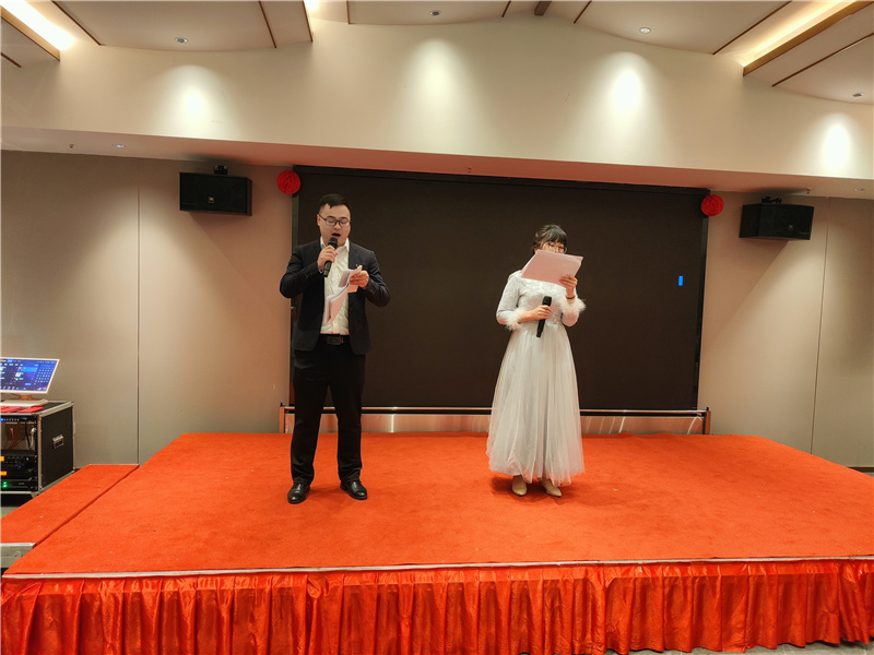 下午5:00伴隨著歡快的歌曲,年會拉開帷幕,銷售部康永和項目部強文杰主持此次年會。